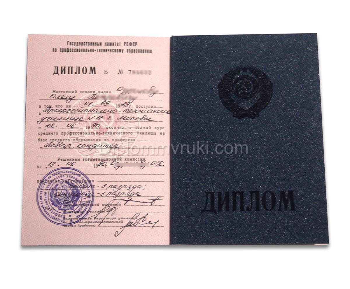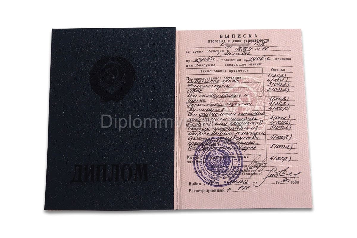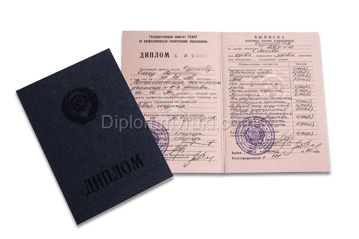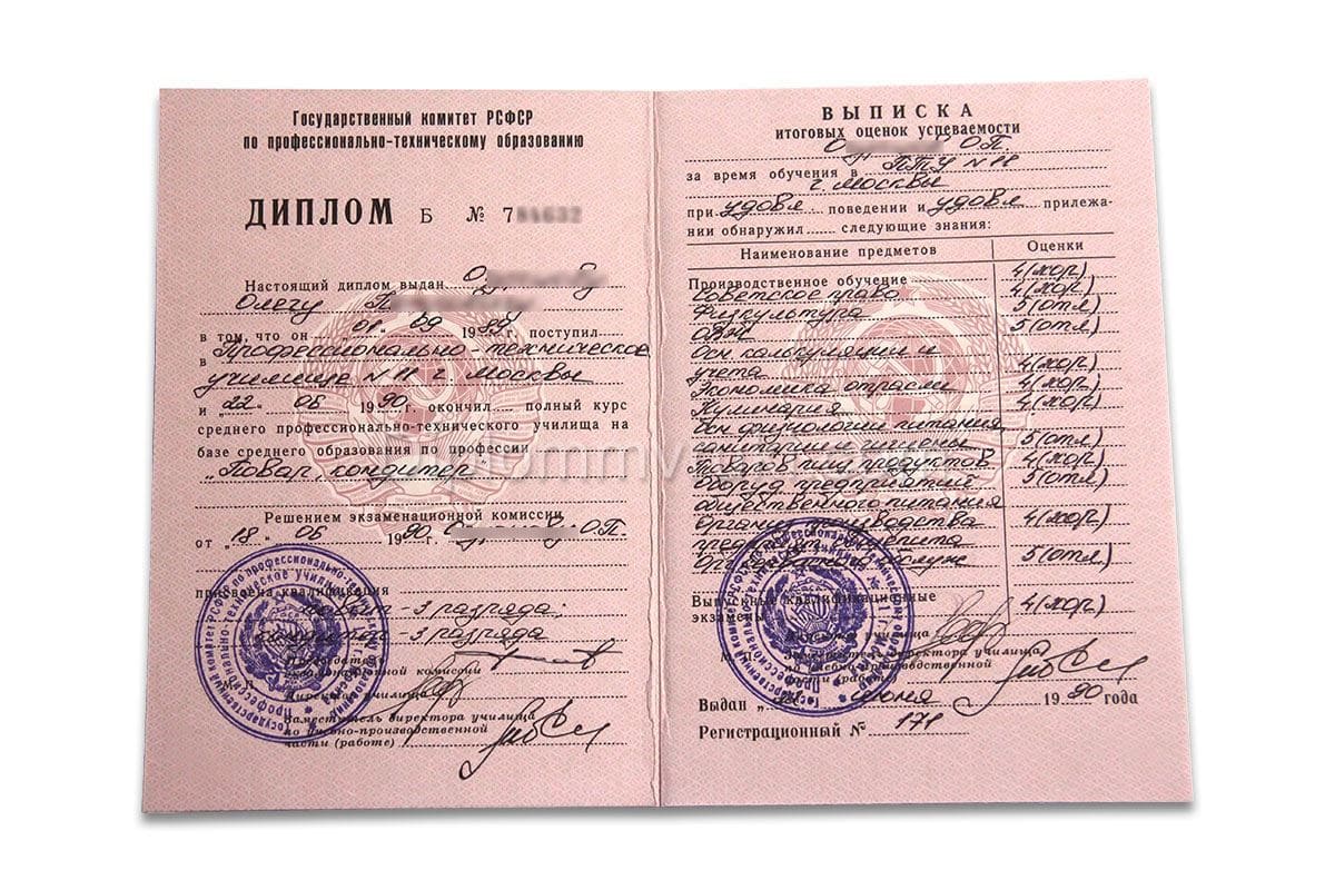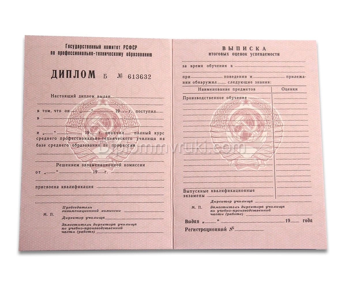 Диплом ПТУ СССР до 1994 года выдавался всем выпускникам несмотря на уже юридическое отсутствие страны Советов. Однако данный образец документа был принят в 1981 году, но со сменой статуса все бланки оставались прежними. Сегодня в покупку включаются корочка и приложение с оценками. На документах имеются все подписи должностных лиц, элементы защиты и мокрая печать. По желанию клиента мы заполняем предметами бумаги сами, либо можем предоставить пустые бланки с печатью. Имеются также дипломы ПТУ СССР до 1994 года с отличием.